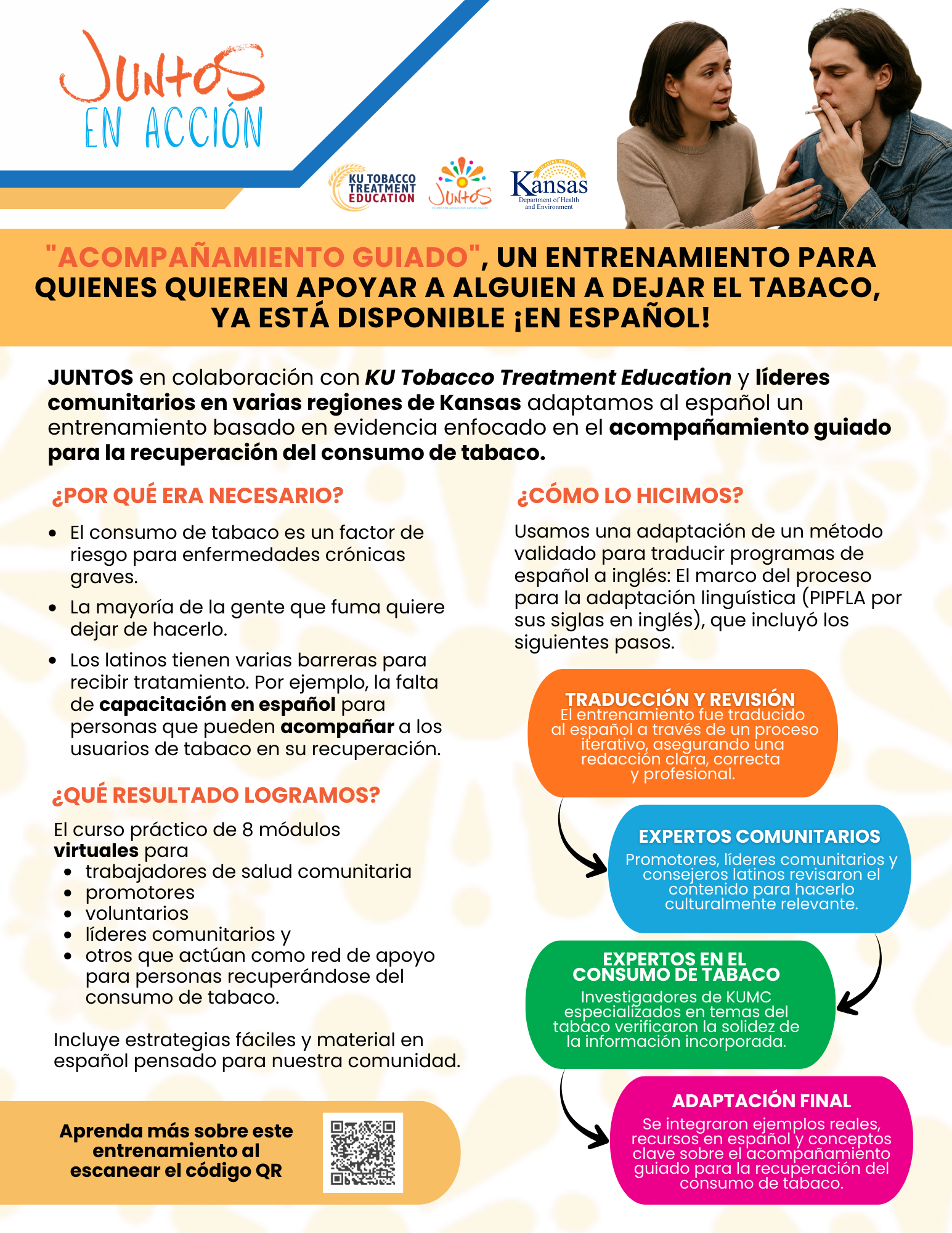 Este curso está lleno de ideas y consejos sobre cómo apoyar a las personas en su proceso de recuperación del consumo de tabaco. Consta de ocho módulos en línea de 15 a 20 minutos, con audio y material visual, que pueden tomarse de manera asincrónica.
